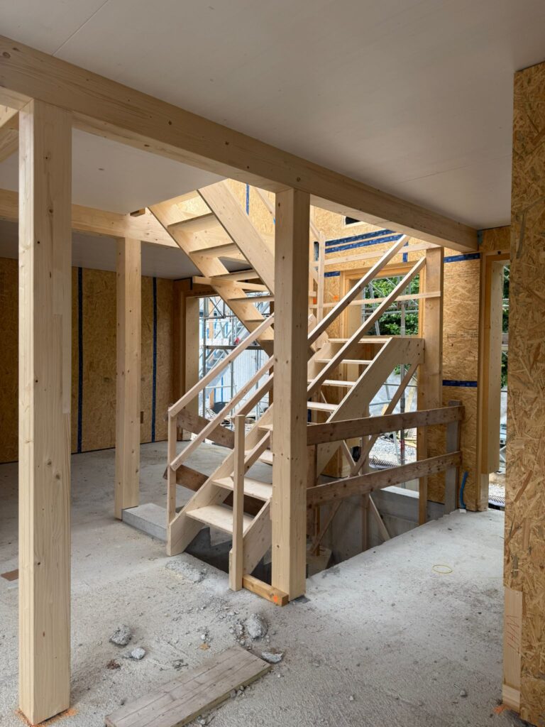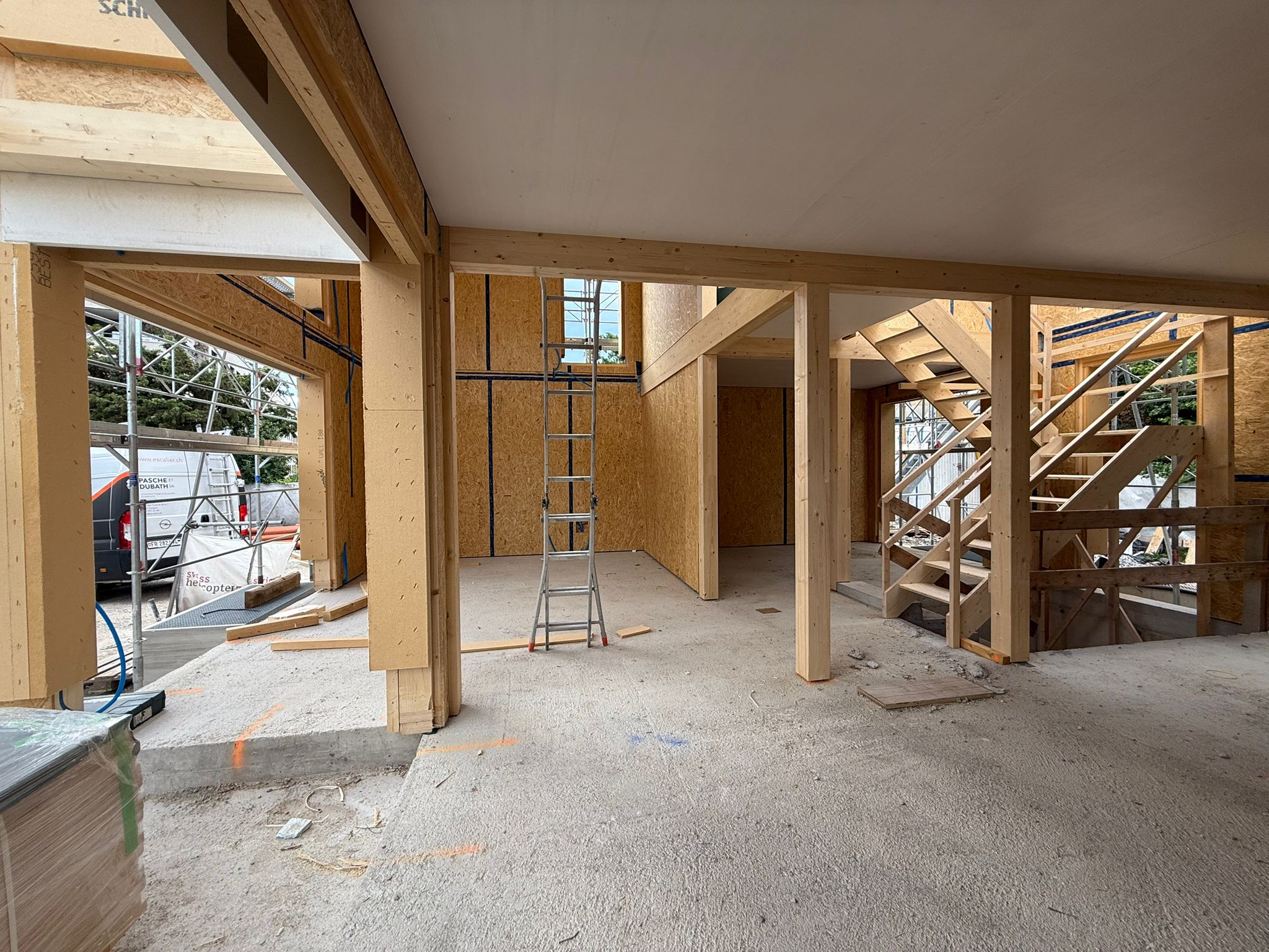 Pose de la structure, murs des façades et des dalles bois en construction préfabriquée pour les deux villas.